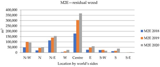 Class M2E wood (wood remains left after machine processing) constitutes a significant group of forest biomass intended for chipping or to be used for energy-supplying purposes (Figure 8). Between 2018 and 2020, the share of this wood on the market increased by almost 90%—from 427,000 m3 in 2018 to 808,000 m3 in 2020. This means that the use of this wood for biomass processing increased. Low-quality materials left after machine processing are better used. The most M2E wood was harvested in Central Poland (42–45%) and in the north (N-E 20–26%, N-W 11–14%).
