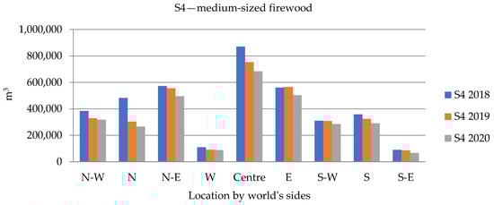 S4 firewood is the most important group of wood resources. In 2019, more than 3,740,000 m3 was harvested, whereas, in 2020, this volume dropped to 2,996,000 m3. The largest amounts were harvested in Central Poland (about 23%), whereas the share of the west (W) and southeast (S-E) was minimal, i.e., about 2 to 3% (Figure 9). The resources of this firewood amounted to over 74% of the biomass produced in Poland, including energy biomass. During the period under analysis, the potential of these resources was gradually decreased due to the decreasing amount of post-disaster wood harvested.