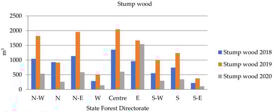 Stump wood is the last item on the list of energy biomass harvested (Figure 10). According to the Polish State Forests Holding, in 2020, about 4400 m3 of stump wood was harvested in Poland. There is a significant but unused potential of logging areas. It is estimated that stump wood in the form of unused biomass for further processing may constitute about 6% of the annual amount of timber harvested (out of the total volume of about 40 million m3) [38,39]. Such a low amount is harvested, because it is necessary to maintain the biological balance of the soil. At the same time, there are no confirmed data on the amount of stump wood harvested in private areas and the areas managed by other public entities. From a climatic point of view, the production of bioenergy from fatwood is much better than the production of non-renewable energy. Fatwood is a valuable biomass raw material, but its harvesting has a negative influence on the environment. Stump woods left to decay are food for numerous wildlife species. Thus, the overharvesting of fatwoods may pose a risk to their populations. Stump woods located next to watercourses, conservation areas, diverse biogroups, etc. should be left. It is also advisable to leave stump woods that have an impact on the ground reinforcement of slopes and escarpments. Stump woods left after logging form a significant part of the dead wood in forests [40].