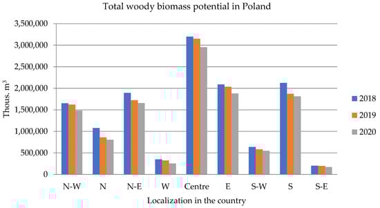 The analysis of the total resources of the wood biomass (Table 3) that could be used for energy purposes revealed a significant potential of Central Poland, where this amount exceeded 1,128,000 m3 of biomass in 2020 (28% of the resources). The lowest biomass resources were found in the southeast of Poland, i.e., only 90,000 m3 in 2019 and 70,000 m3 in 2020.