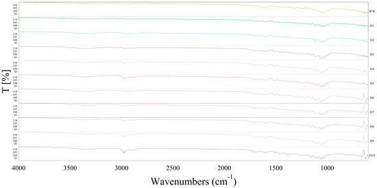 FT-IR analysis was performed to examine the effects of bioliquid recirculation on the characteristics of hydrochar (Figure 3). A peak at 1160 cm−1 signified the vibration characteristics of cellulose and hemicellulose in all hydrochar. This indicated the presence of undecomposed crystalline cellulose and hemicellulose. A peak at 3700 cm−1 that was only observed in WW indicated the presence of alcohol (O-H), implying that this was what was decomposed by HTC. A peak from 3600–3200 cm−1, which indicated an O-H bond, was discovered in every sample; however, it tended to decrease gradually with the recirculation of bioliquid. This indicated that bioliquid recirculation accelerated hydrolysis by HTC. We hypothesize that the amount of bioliquid produced remained constant because of this phenomenon. The peak decreased significantly after H6 because hydrolysis had been promoted by organic acids in the bioliquid, which were more scarce following this cycle. Due to the acidity of the initial environment, the degradation response strengthened, leading to the further decomposition of glucose. A peak at 3300 cm−1, indicating a carboxylic acid compound, was caused by the oxidation of alcohol and the hydrolysis of ester. This peak showed a trend similar to previous peaks, decreasing significantly at H6.