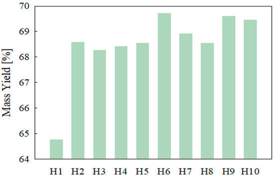 Figure 4 shows the mass yield of hydrochar. The mass yield increased the most in the first step of bioliquid recirculation, from 65% in H1 to 69% in H2, and reached its highest, 70% in H6. The increase in mass yield in H1 to H2 is more pronounced than that in the other stages. This is because H1 is a hydrochar produced using biomass and water, whereas H2 is hydrochar produced by recirculation bioliquid. In other words, there is no material catalyzing the HTC mechanism when H1 was produced. However, when H2 is generated, the HTC mechanism is promoted by organic acids and intermediates in the bioliquid; therefore, it shows a rapid increase rate compared with other steps. The mass yield of hydrochar was lower than that of biomass because cellulose and hemicellulose are decomposed to form by-products in gaseous and liquid states [37].