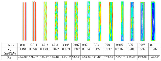 However, the method of transition from vortexes to cyclic flow is specific. The calculations show that already at b = 22.5 mm the vortexes’ flow starts to lose stability, and we can say that the problem becomes essentially non-stationary. Figure 6 shows the airflow velocity fields in the gap between the panes of a double-glazed window with H = 1.06 m and ΔT = 37 °C. As can be seen from the figure, the airflow in the gap is extremely unstable: a vortex forms, disappears and cyclic flow boundary layers form again. At the same time, there are significant variations in the thermal resistance values of double-glazed windows. Moreover, no periodicity of these changes has been noted. Therefore, starting from b = 22.5 mm, the thermal resistance Rt was calculated by averaging the thermal resistance values. At b > 50 mm, vortexes disappears and stable boundary layers form in the gap along the vertical pane surfaces (Figure 2).