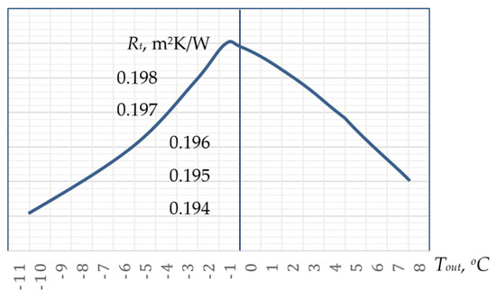 Figure 3 shows the results of calculations of thermal resistance of a double-pane window with a thickness between the panes b = 0.015 m, height H = 1.06 m, Tin = 15 °C, depending on the outdoor temperature Tout.