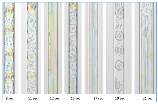 Velocity fields in the channel b = 30 mm as a function of time.