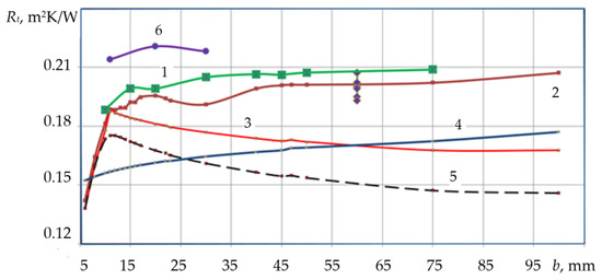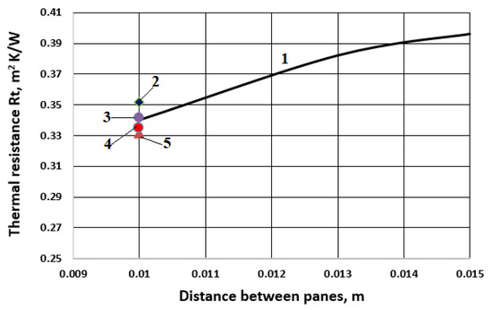 At the same time, the one-dimensional models (curves 3 and 5 in Figure 7) show a decrease in thermal resistance, and the one-dimensional model [20] (curve 4) maintains an increasing trend of the function Rt = f(b). The differences between the Rt values obtained from the one-dimensional and two-dimensional models are 13–14% (curve 3—WINDOWS model), 8 –16% (curve 4—model [20]), 24% (curve 5—ASHRAE model). The data presented in [20] indicates that the maximum thermal resistance in the function curve Rt = f(b) occurs in the area b = 0.012 m, which coincides with the calculations carried out in this paper using one-dimensional models (curves 3 and 5).