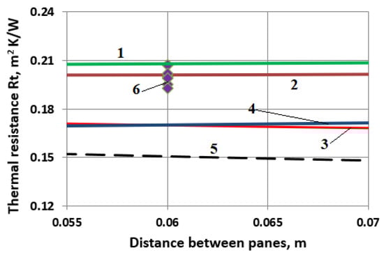 Thermal resistance of a double-glazed window depending on the thickness of the gap between the panes: 1—results of calculations in the CFD Fluent package; 2—results of calculations in the CFD Star CCM package; 3—results of calculations of the one-dimensional model; 4—results of calculations from Formula (2) with correction (3), where χ = 0.105Ra0.3; 5—calculation results from Equation (2) with correction (3), where χ = (1 + (0.03303Ra0.402)11)0.091; 6—results of calculations in Star CCM CFD package with the gap between the panes filled with argon gas.