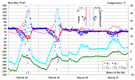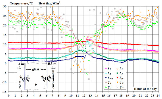 Figure 9 shows a typical fragment of daily (21 February 2015) measurements of temperature and heat flux in the center of the glass of the old window (according to the scheme, inset in Figure 8) from a series of experiments for the period 20 February–15 March 2015. The window was installed in the center facade of the second floor of a three-story administrative building. The orientation of the window is strictly to the South. During the experiments, there were no personnel in the technical room corresponding to the window. The standard heating system was in operation. There were no other heat sources.