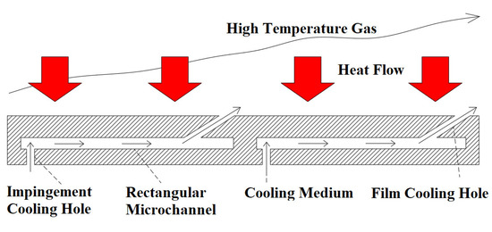 The research craze for microchannels began in the 1980s due to the cooling requirements of integrated circuits (IC). In 1981, Tuckerman and Pease [1] built the first microchannel heatsink and proved its huge potential for IC cooling. There is no strict limit on the size of the microchannel [2,3,4], and the rules of division may change in the future [3]. Celata [4] considered that a channel with a hydraulic diameter of 0.1 mm to 1 mm can be considered as a microchannel. Microchannels with a hydraulic diameter of about 1 mm can be used as the cooling channels inside the turbine blades. In recent years, the cooling of gas turbines has been developing from macro- to micro-cooling. The micro-cooling in turbine blades is mostly performed by the rectangular microchannels, which typically occur in turbine blades along with impingement cooling or film cooling, as shown in Figure 1, or as independent channels close to the wall [5]. The application of rectangular microchannels on the turbine blades started late, but due to the simple and easy fabrication of rectangular microchannels, there are many related studies. However, the conclusions reached by some scholars are inconsistent.