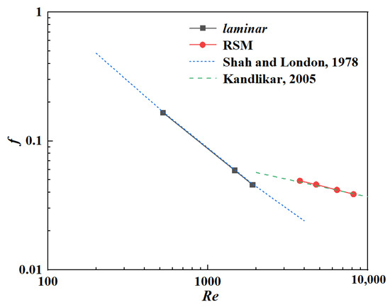 In order to further verify the applicability of laminar and Reynolds stress model (RSM, linear pressure–strain, enhanced wall treatment), the f of the smooth channel shown in Figure 3 with 90 mm inlet and outlet sections was evaluated. Moreover, the selected entrance section does not completely avoid the influence of the entrance. The f is plotted as the function of Re in Figure 5, together with the Shah and London [44]’s correlation for a fully developed laminar flow in rectangular channels,