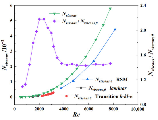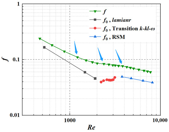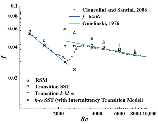 As shown in Figure 6, the critical Reynolds number and f in the turbulent region obtained by k-ω SST are relatively small for the incoming flow of uniform velocity and 5% turbulence intensity, and the results obtained by transition SST are far from the experimental law [45]. The critical Reynolds number obtained by transition k-kl-ω is slightly smaller than that of the experiment [45], and a transition peak appears. The f obtained by transition k-kl-ω is slightly larger than the fully developed turbulent law [46] and is very close to that obtained by RSM at Re about 3647. When the Reynolds number is greater than 2000 and less than 3700, the f law obtained by transition k-kl-ω can be trusted.