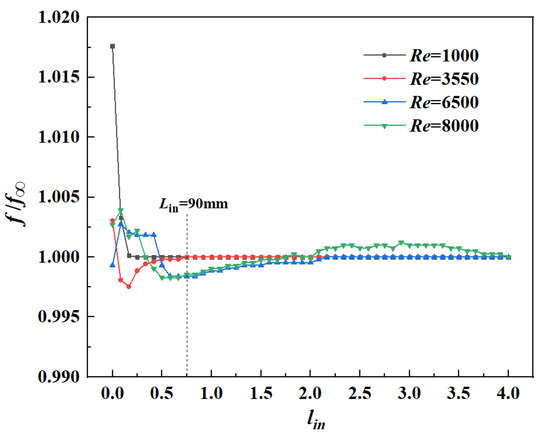 The extended inlet section is appended to the microchannel to develop the flow. The normalized friction factor f/f∞ of the test section is plotted in Figure 7 as a function of the normalized length lin (lin = Lin/L) of the inlet section, where f∞ is the friction factor when lin = 4. It can be observed from Figure 7 that the normalized friction factor stops changing drastically since lin is longer than 0.75 (Lin = 90 mm). This indicates that the flow stability has been relatively high, although the flow under some working conditions is not fully developed. We choose the inlet section and outlet section with a length of 90 mm in order to obtain the fully developed flow in the test section.