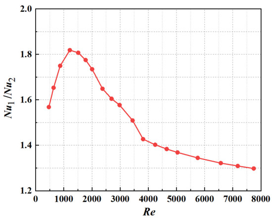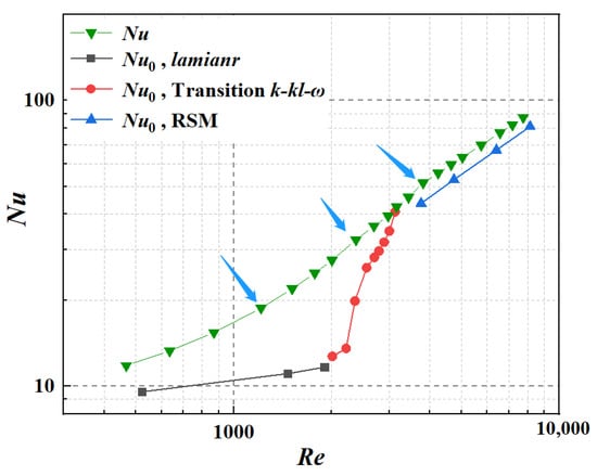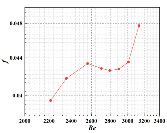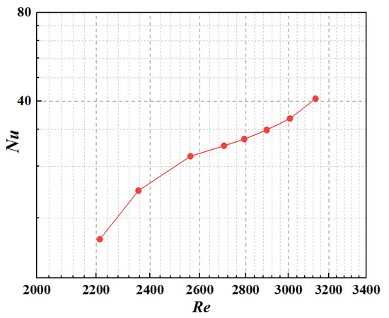 The function of the friction factor changing with the Reynolds number can reflect the change of the flow state, as shown in Figure 8. It is shown that the flow state changes at the Reynolds numbers of 2214, 2793, 3133, and 3450, which are also the inflection points of the curve of friction factor versus Reynolds number. This is also reflected in the variation in the averaged Nusselt number with the Reynolds number, as shown in Figure 9.
