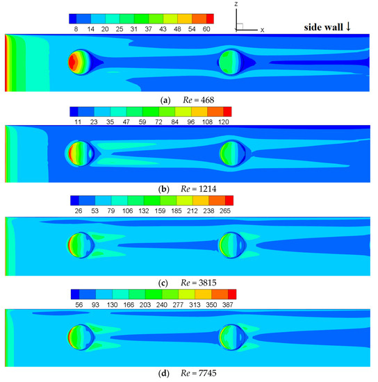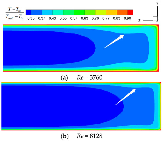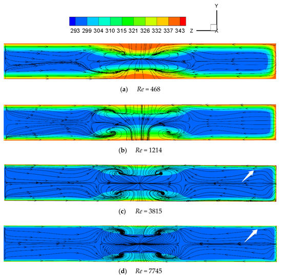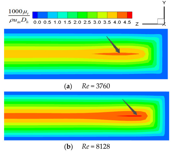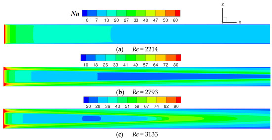 When the Reynolds number is greater than 2214 and less than 2793, the distribution of the Nusselt number, velocity, and turbulent kinetic energy is similar to that of the Reynolds number of 2793. Combining with Figure 13, it can be inferred that the generation law of boundary layer and turbulence is consistent in the Reynolds number range of 2214 to 3133. Affected by the factors such as the inlet, it is more likely to form turbulent flow near the side wall, and the turbulent viscosity is much larger than the molecular viscosity, so the resistance near the wall surface becomes larger, which results in the higher flow velocity in the middle of the channel. A flow boundary with a higher velocity is more prone to turbulence. As the flow develops, the turbulent zone near the side walls becomes larger and the velocity magnitude in the middle of the channel becomes higher. Eventually, the turbulent zones will meet in the middle of the channel, resulting in the Λ-shaped distribution of velocity and turbulent kinetic energy shown in Figure 11 and Figure 12. It can be seen from Figure 12c that the turbulent kinetic energy reaches the maximum after the two turbulent regions near the sidewall meeting each other, and the maximum velocity is upstream of the meeting point. The velocity and turbulent kinetic energy of the fluids gradually become uniform after mixing. The distribution of the Nusselt number follows the distribution of the turbulent kinetic energy, except near the inlet, where the influence of thermal boundary layer generation is significant and the Nusselt number is high.