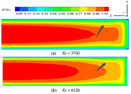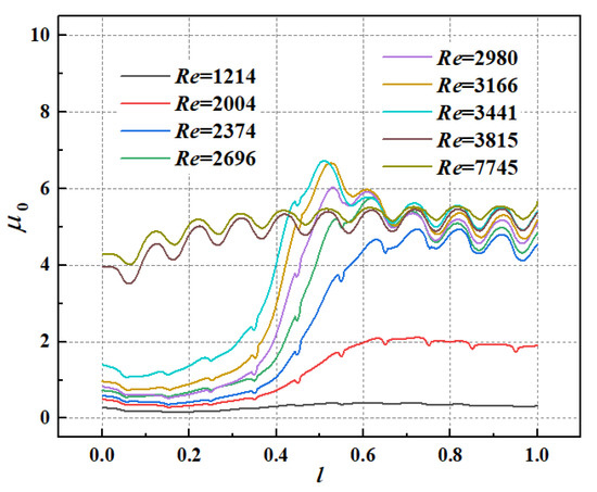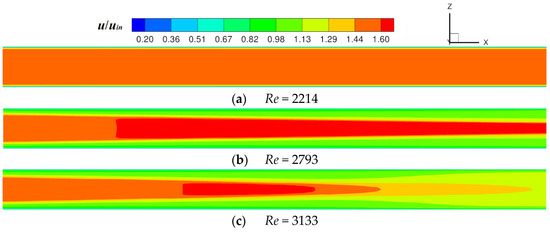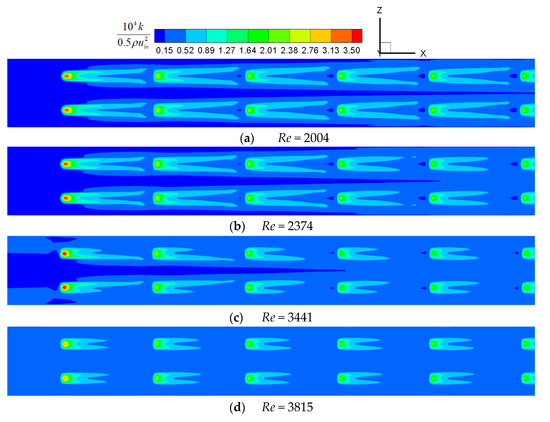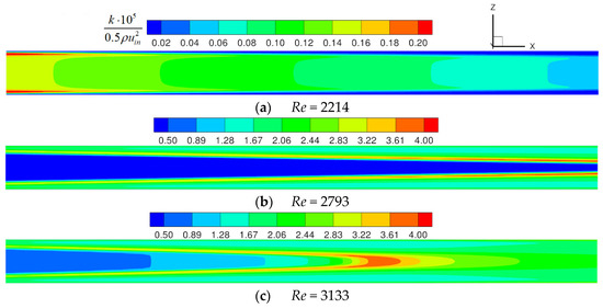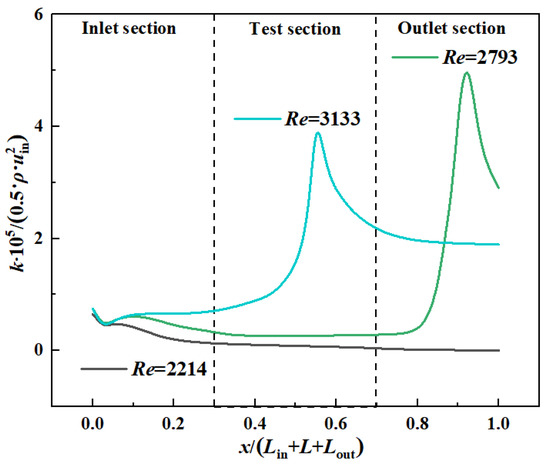 It can be analyzed from Figure 13 that when the Reynolds number is small, before the velocity of the accelerated fluid in the middle of the channel reaches the highest level, the turbulent kinetic energy decreases slightly along the flow, such as when Re = 2793. However, when the Reynolds number is large, the turbulent kinetic energy of the accelerated fluid in the middle of the channel increases along the flow until a Λ shape is formed, such as when Re = 3133.