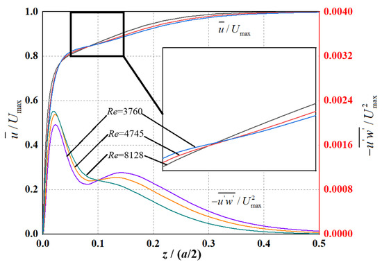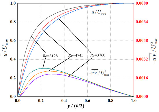 The velocity and Reynolds stress component laws shown in Figure 15 and Figure 16 are significantly different near the wall. The flow pattern near is similar to that in a circular tube. The larger the Reynolds number, the faster increases from and the peak value of is closer to , which indicates that the thickness of the flow boundary layer decreases with the Reynolds number.