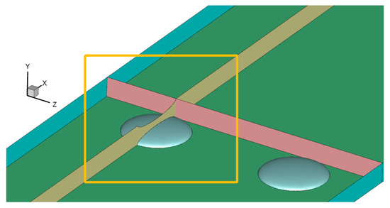 The microchannel with semi-ellipsoidal protrusions has the same size as the microchannel without semi-ellipsoidal protrusions, except that there are symmetrical protrusions on the primary walls and each wall contains two columns of protrusions with each column containing 10 protrusions. In addition, the microchannels with and without semi-ellipsoidal protrusions have extensive inlet and outlet sections as shown in Figure 3. The microchannel without semi-ellipsoidal protrusions is called smooth channel, and the microchannel with semi-ellipsoidal protrusions is called roughened channel. Additionally, the detailed geometric dimensions of the channel with semi-ellipsoidal protrusions are shown in Figure 4. It is worth noting that the semi-ellipsoidal protrusion shows a circle with a diameter of 2 mm (D) on the X-Z plane, and shows a semi-ellipse with a semi-major axis of 1 mm (D/2) and a semi-minor axis of 0.2 mm (h) on the X-Y plane.