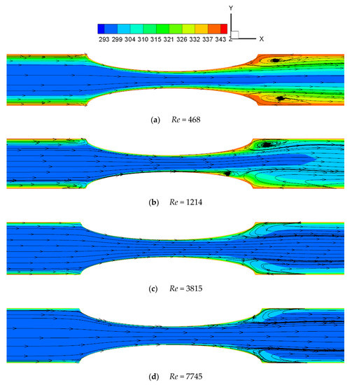 It is shown in Figure 5 that the results obtained by laminar are consistent with Shah and London [44]. It shows that the friction factor of the laminar flow passing through the inlet section is very close to the fully developed laminar flow. In the turbulent region, the friction factor law obtained by RSM is consistent with Kandlikar [25]. Since the turbulence is not fully developed, the calculation results of RSM are reliable. For the roughened channel, there are usually vortices around the protrusions [36,37,38,39,40], and RSM has a stronger advantage than other turbulence models of the RANS method in calculating vortices.