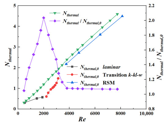 To sum up, for the smooth channel, the results obtained by laminar are used when Re < 2000, the results obtained by transition SST are used when 2000 < Re < 3700, and the results obtained by RSM are used when Re > 3700. For the roughened channel, the results obtained by RSM are used in all cases.
