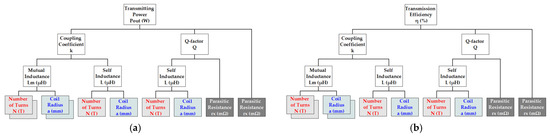 Figure 4a,b. The components constructing the transmitting power comprise the coupling coefficient, k, Q factor, and parasitic resistance. The coupling coefficient is proportional to the mutual inductance between the coupling coils and inversely proportional to the self-inductances. The mutual inductance can be derived using the Neumann formula with the radii, air gap, and number of turns of two coupling coils. The self-inductance can be derived by an inductance formula with a correction coefficient by feeding in the radius and number of turns of the coupling coil. Likewise, there are identical components in the expression of the power transfer efficiency.