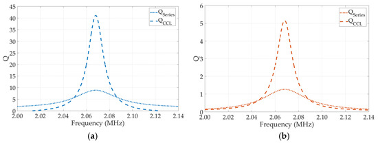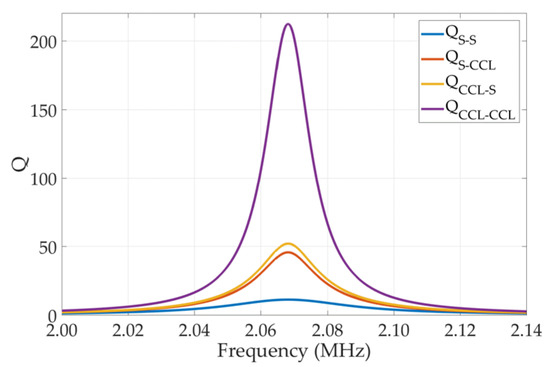 The self-inductance for the coupling coil and the parasitic resistance (Rac) were derived in advance. Likewise, the ESR was also derived by the relevant formula as Equation (8). The coil current was derived depending on the impedance of the coupling coil and the capacitors, and the circuit Q factor was calculated according to the coil current and the inductance. The simulation results of the Q factor are demonstrated in