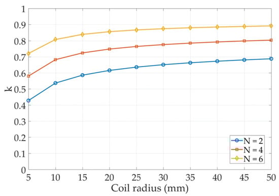 The coil radius ranged from 5 to 50 mm, and the number of turns varied from 2 to 6 T. The alteration of the coupling coefficient, k, is shown in