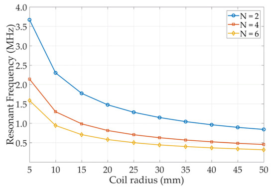 Figure 10, the increased coil radius leads to the deviation of the resonant frequency. Likewise, the deviation of the resonant frequency becomes moderated when the coil radius increases to a certain extent. The number of turns and coil radii have distinct resonant frequency deviations, e.g., for the helical coupling coil with six turns, the resonant frequency reaches 1.5 MHz when the coil radius is 5 mm; as the radius increases, the resonant frequency can fall under 0.5 MHz.