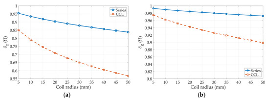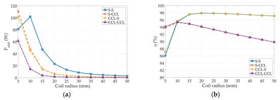 Figure 15a,b, respectively. Apparently, the magnitude of the efficiencies, regardless of the transmitter or the receiver, reduces with the radius. The efficiency of the series circuit has less reduction, whereas the efficiency of the CCL circuit is remarkable. In summary, the simulated results showed that the transmitting power inevitably decreases with the radius of the helical coil due to the parasitic resistances.