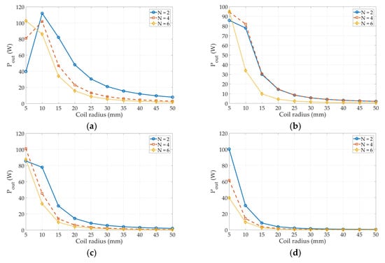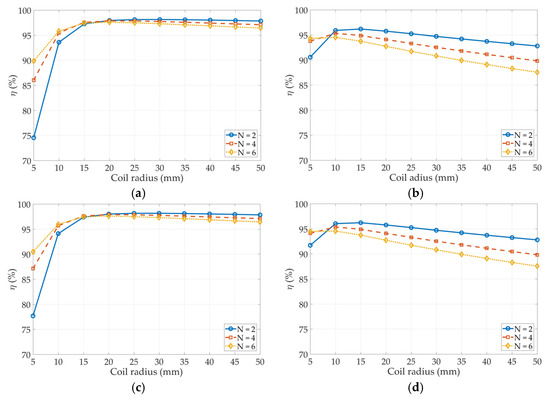 Figure 12d presents the variation of the transmitting power for the CCL–CCL topology with the number of turns and the radius. It is clear that the transmitting power decreases with the increased number of turns; similarly, it declines exponentially.