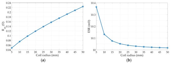 Figure 14b. The ESR decreases with the radius of the helical coil, differing from the parasitic resistance of the helical coil. According to the definition of the ESR in Equation (8), it is related appreciably to the operating frequency. However, the variable in the ESR resistance is the radius of the helical coil, and the alteration in the radius shifts the resonant frequency. Therefore, the ESR of the capacitor varies with the radius of the helical coil.