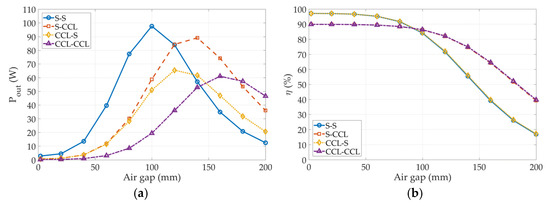 The power transfer efficiencies of the topologies decrease with the air gap. Likewise, the power transfer efficiencies are also divided into two groups. In the first group, the S–S and CCL–S system topologies have a higher power transfer efficiency at a shorter air gap until 100 mm; afterward, the power transfer efficiency renders a heavy decline. The other group has low efficiency within the air gap of 100 mm, but the amplitude of efficiency decline is small. When the CCL circuit is applied to the receiver side, its circuit efficiency is low, whereas it is high when the series circuit is applied to the receiver side.