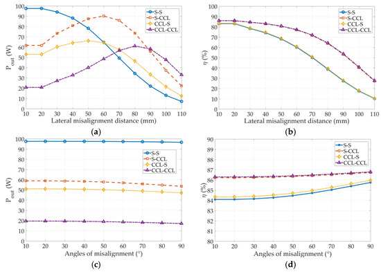 Similarly, the variations in the power transfer efficiencies show two distinct trends. The power transfer efficiencies of topologies in lateral misalignment decline with the lateral distance; the S–S and CCL–S topologies show a significant reduction, while the S–CCL and CCL–CCL topologies show only a slight reduction in the power transfer efficiency. Conversely, the power transfer efficiencies of the topologies appear to rise with the increase in the angle of misalignment, regardless of the topology type. Nevertheless, the power transfer efficiencies of the S–S and CCL–S topologies significantly rise, whereas the variation is flat in the case of the S–CCL and CCL–CCL topologies.
