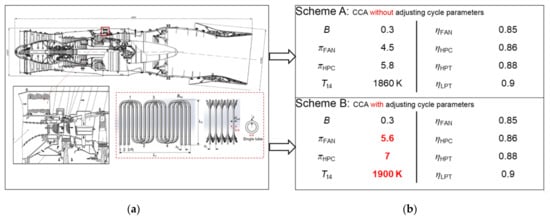 The concept diagram of CCA technology and engine schemes. (a) Diagram of CCA technology [27]; (b) Cycle parameters of design point.