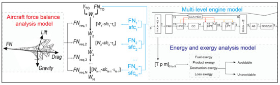 Before the exergy analysis, the basic thermodynamic parameters need to be identified to calculate the exergy parameters, including temperature, pressure, and mass flow of working fluid at each component. Thus, the thermodynamic analysis based on the conservation of energy is essential. Distinct from other energy systems, the aircraft engine usually needs to satisfy the various thrust requirements for different flight conditions. So, it demands an integrated model to calculate the needed thrust at each mission segment and synchronously determine the engine’s working condition. Based on the integrated model, the thermodynamic analysis of different engine schemes has been conducted during the full flight mission. In this framework, the aircraft-engine thermodynamic program, including aircraft force balance analysis, multi-level engine, and energy/exergy analysis models is developed, and its logic diagram is presented in Figure 2. The simulating steps are as follows:
