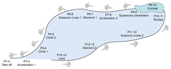 For the flight mission part, a typical flight mission of an advanced tactical fighter is shown in Figure 3, in which both flight environment and mission requirements are various. According to Ref. [28], a type of mission is described in Table 2 for the fighter in current research. The segments of the flight mission are take-off (1–2), acceleration (2–3), climb (3–5), subsonic cruise (5–6), descend (6–7), acceleration (7–8), supersonic penetration (8–9), combat air patrol (9–10), escape dash (10–11), subsonic cruise (11–12), descend (12–13), and land (13–14).