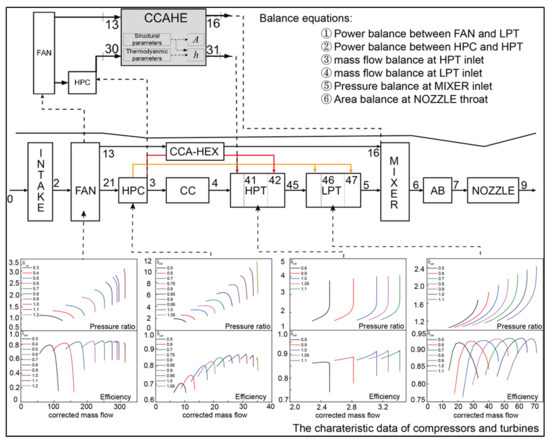 CCA technology firstly utilizes the cooling capability of bypass air or fuel to cool the bleed air from the high-pressure compressor (HPC), and then the cooled air absorbs more heat loads from the high-temperature components in the engine [7]. NASA has reported that the lower bleed air temperature could also be used to permit operation at lower coolant flows or higher turbine inlet gas temperatures [8]. Another study has also demonstrated the satisfactory performance of CCA technology in preventing turbine blades from ablating by high-temperature gas [9]. Recent research has pointed out that CCA technology could improve the thermal efficiency of the supersonic commercial engine, reducing its fuel consumption by about 453.59 kg per flight mission [10]. Consistently, the take-off carrying capability and accelerating ability of the military turbofan engine could also be improved by CCA technology [6].