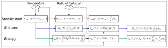 Air and gas are considered ideal gases. The enthalpy, entropy, as well as constant-pressure specific heat data are regarded as the polynomial functions of the temperature and the ratio of the fuel to air, and the flowchart of properties calculation is given in Figure 5.