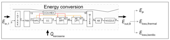 For the engine, the input energy includes the heat of fuel combusting Qkerosene, and the energy of the inlet air Ein,1. The major energy leaves the system in the form of the kinetic and internal energy of the exhaust gases in Point 9 in Figure 6 Eout,9, which is composed of the propelling work and the exhaust thermal and kinetic loss. According to the definition of the total energy of a flowing fluid [35], neglecting the gravitational potential energy, the total energy of fluid at the inlet and outlet could be written as: