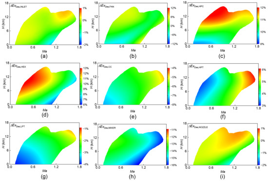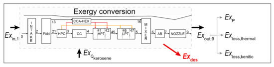 For the engine, the physical exergy of inlet air and the chemical exergy of aviation kerosene flow into the system from the environment. After a series of exergy conversions, the exergy flows out the control volume in the form of the physical and kinetic exergy contained in the nozzle exhaust gas, as shown in Figure 7. Meanwhile, the destruction exergy appears due to the irreversible procedures occurring in the engine, such as frictional loss and heat transfer. Based on these, the balance equations for this system are given in Equation (24):
