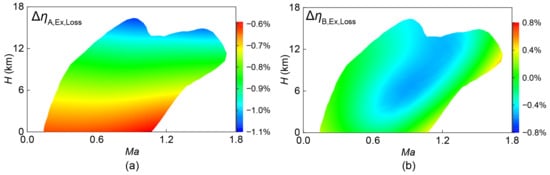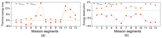 Solving the simultaneous equations from Equation (24) to (26), the correlations among fuel, product, loss, and destruction exergies are more clear, as given in Equation (27). The fuel exergy includes the chemical exergy in aviation kerosene and the heat exergy. The first and second terms on the right-hand side of Equation (27) are the product exergies, representing the propelling work. The loss of thermal exergy is determined based on the thermal parameters of exhausted gas, such as its enthalpy and entropy, and the loss of kinetic exergy is dependent on the stream velocity at the inlet and outlet. The last item reflects the destruction exergy caused by the irreversible process.