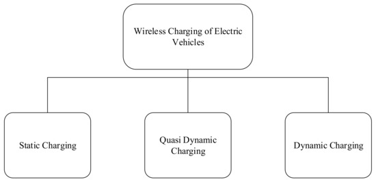 There are three main wireless charging methods for EVs, and they are given in Figure 1. These are static, quasi-dynamic and dynamic charging. Static charging is the wireless charging of EVs in parking areas when it is in a stationary position. There are some limitations to this type of charging, such as limited overall driving range, typically long charging times, etc. Quasi-dynamic charging offers increased driving range along the trip, with charging pads implemented at the bus stations and at traffic light stops [7]. This means the EV can be charged not only during parking but also at temporary stops or while moving slowly. In dynamic charging, the primary track is buried into the road and spread, with the target to energize the EV during the trip while driving. The cost of dynamic charging is more than the other charging methods, but the most important problem of all EVs is the limited range, which can be eliminated with this method. A good review on cost comparisons for charging methods was performed by investigating two commercial product costs, and it seems that stationary charging is the most cost-effective method [8]. The main focus of this paper is a review of the stationary charging of EVs.
