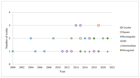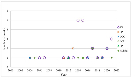 Number of works of compensation topologies used in academic studies by year of publication.