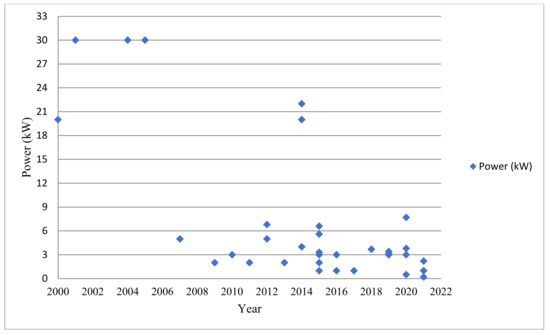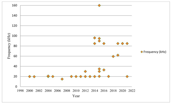 As seen from Figure 9 and Figure 10, the frequency and efficiency values are increasing over the years. Efficiency values have been reaching more than 90–95% in recent years. In the first years, the operating frequency was chosen as 20 kHz in many applications. However, in recent years, parallel to the developments in semiconductor switching technologies, the value of the operating frequency has increased, and 85 kHz has gradually become a standard value for standard charging power levels. In addition, many commercial companies produce their products at two different frequencies, 20 kHz and 85 kHz. Figure 11 shows the variation of power values selected in academic studies on wireless charging of electric vehicle battery applications over the years. According to the graph, the most used power range is between 1 and 5 kW, and values of 3.3 and 3.7 kW are especially selected. There are some higher power values which are especially for EV buses. The power values of 3.7, 7, 11 and 22 kW have become standard charging values for EVs [54].
