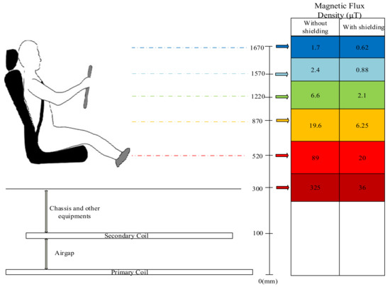 The conductivity (S/m) and relative permittivity (F/m) values for relevant human tissues at 100 kHz frequency are given in [71]. In order not to exceed the permissible threshold values, many methods have been proposed in the literature and supported by studies. A shielding sensor coil was proposed for reducing the leakage magnetic field for a 500 W WPT system, and the measurement results were compared to SAE standards [72]. Magnetic field density values for a 2 kW WPT system with an operating frequency of 20 kHz, which is the frequency range commonly used in electric vehicle applications, are investigated and measured in terms of human exposure can be shown as an example study [27]. An aluminum plate is used as shielding to reduce magnetic field density values in this work. In order to show the effect of aluminum shielding effect on magnetic field density values of a 1 kW WPT system with an operating frequency of 20 kHz and hexagonal coil, the 3D model was created and analyzed on ANSYS Maxwell [30]. The FEA (Finite Element Analyses) results show that the aluminum shielding has a significant effect on reducing the magnetic field density. The results are given in Figure 14.