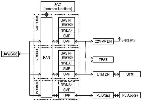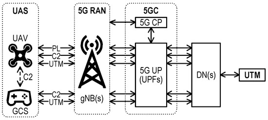 A simplified view on the UAS/UTM and 5GS entities (PL—payload, gNB—5G base station).