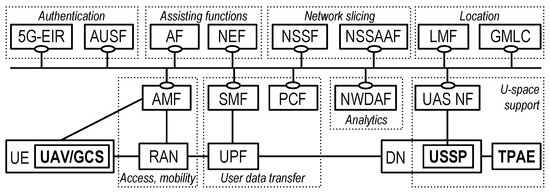 - Kukliński, S.; Tomaszewski, L.; Korzec, P.; Kołakowski, R. 5G-UASP: 5G-based multi-provider UAV platform architecture. In Proceedings of the 2020 6th IEEE Conference on Network Softwarization (NetSoft), Ghent, Belgium, 29 June–3 July 2020; pp. 242–246. [Google Scholar] [CrossRef]
