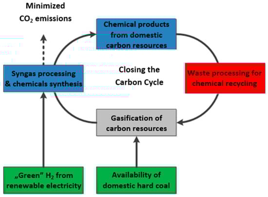 At the beginning of the chain of a linear carbon economy are the mining of coal and the import of oil and natural gas. At the end of the chain, carbon, contained in chemical products or energy carriers, is burned in power plants, internal combustion engines and waste incinerators and released into the atmosphere as CO2. While the energy industry is gradually switching to coal-free energy sources, i.e., renewable electricity, e-hydrogen, the chemical industry still relies on coal to supplement its demand in alternative sources [].