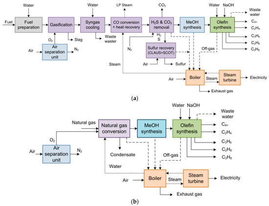 Technological configuration of the olefins production system: (a) solid fuels, (b) gaseous fuels.