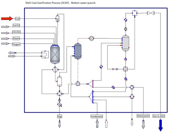 Process model of the gasification system (Shell Coal Gasification Process (SCGP)—Bottom water quench, ChemCAD v7).