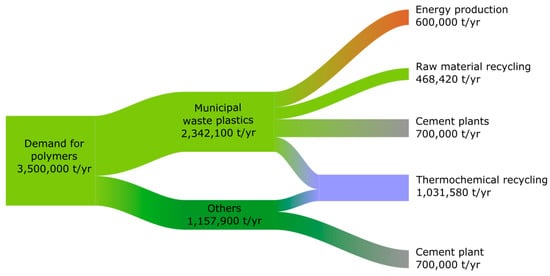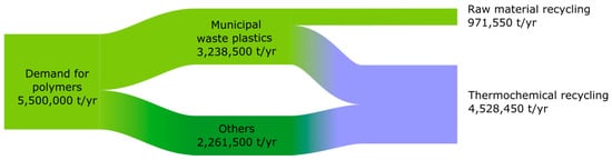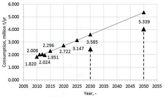 In terms of the demand for plastics, Poland ranks sixth (6.8% share) in Europe. The Polish plastics converting industry consumed approx. 3.13 million tonnes of various polymers in 2020. Plastics are used mainly in Poland in the packaging (35%), construction (24%), and automotive (10%) industries []. The demand for polymers in Poland has been estimated on the basis of data and growth forecasts according to the study “Forecasts of chemical industry production in Poland until 2020” []. Using the above data, polymer demand values for 2030 and 2050 were linearly extrapolated (Figure 4). For further calculations, polymer demand values for 2030 and 2050 were assumed to be 3.5 and 5.5 million t/yr, respectively.